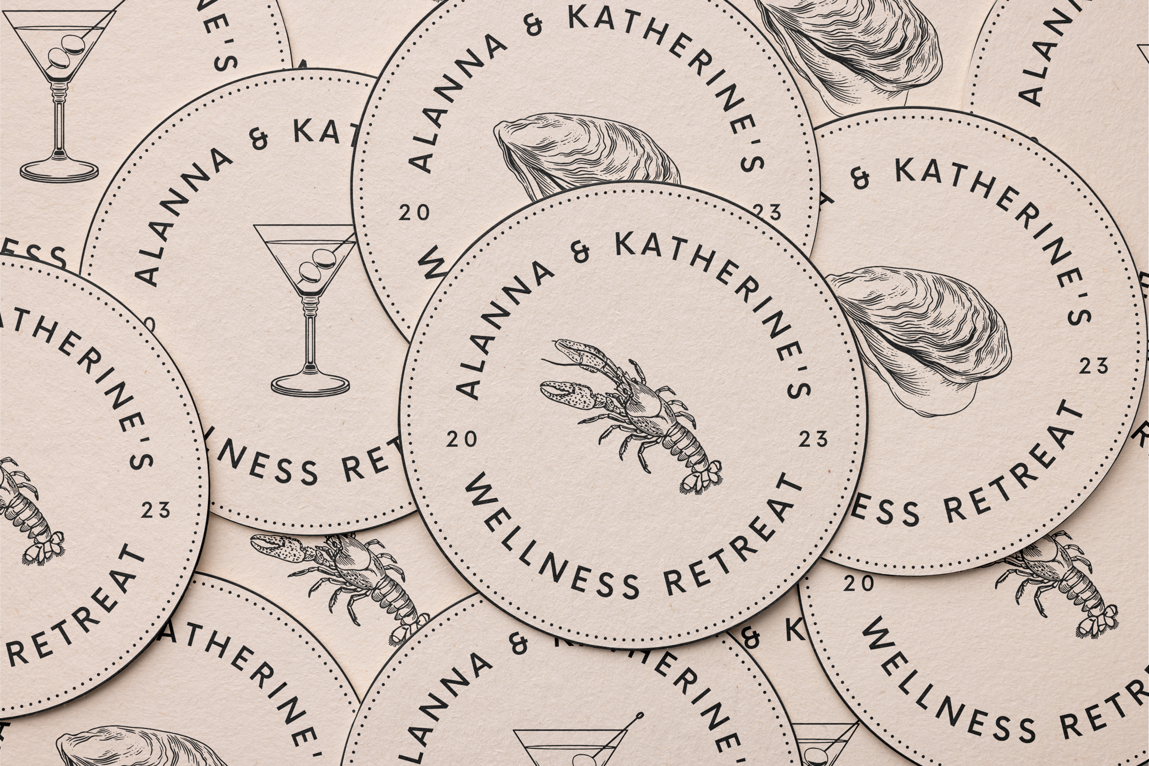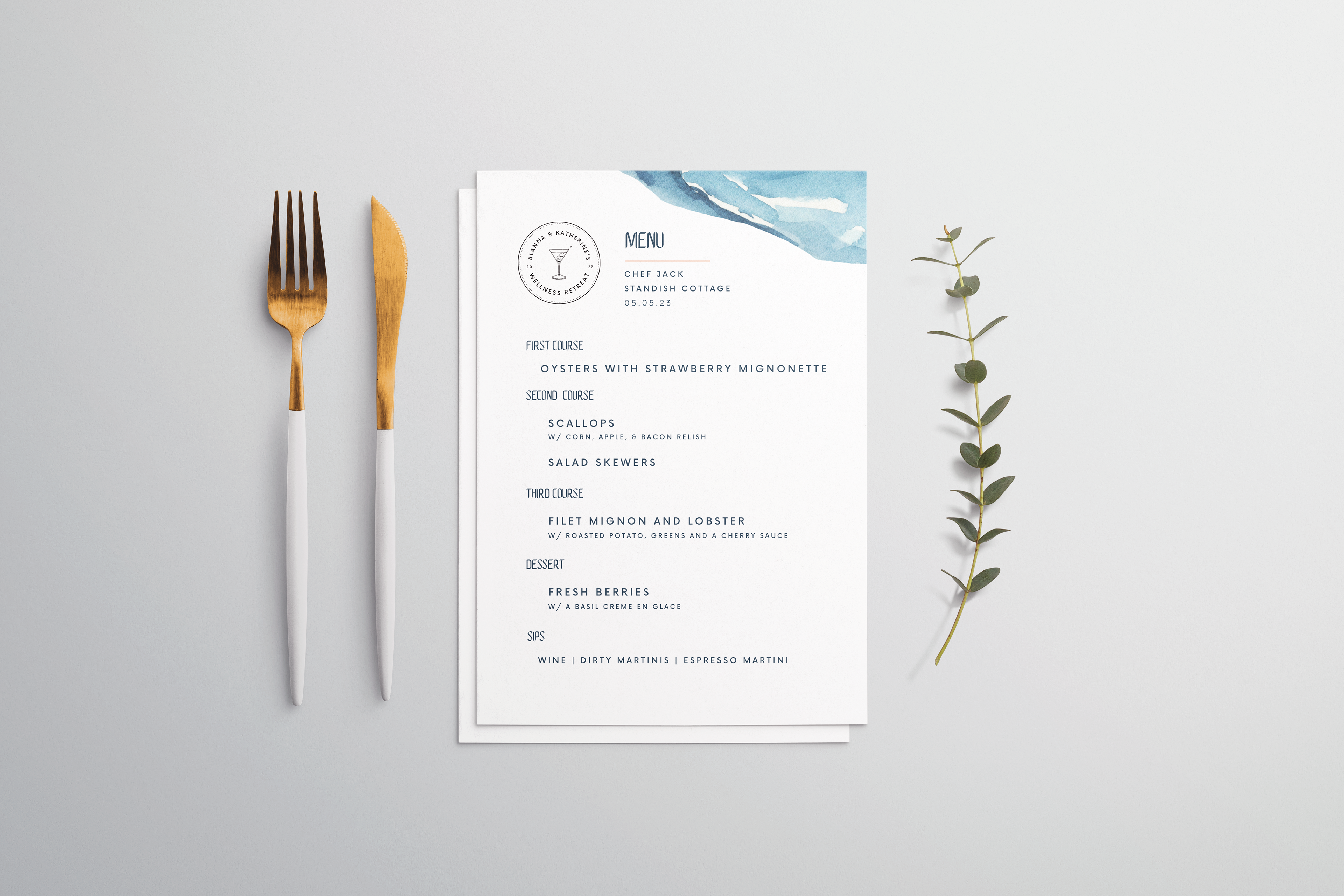 Customized menu, itinerary, and coaster design for Maine wellness retreat